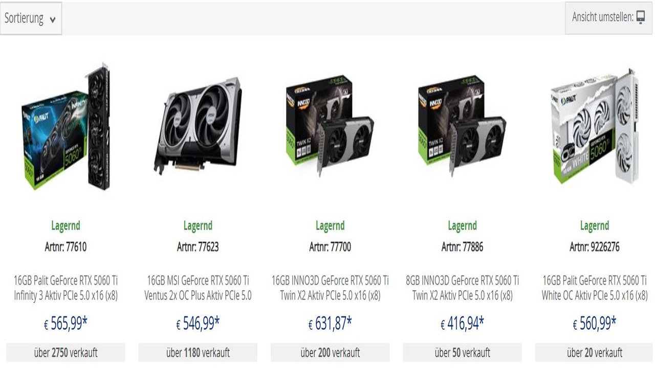 RTX 5060 Ti 8 GB ve 16 GB varyantları Mindfactory’de hâlâ bulunabiliyor; birçok bölgede fiyat düşüşü gözlemleniyor. Sonuç olarak, RTX 5060 Ti 16 GB kısa süre önce $700’a kadar çıkan fiyatından gerileyerek Amazon.com ve Mindfactory’de $539–$549 aralığına indi.