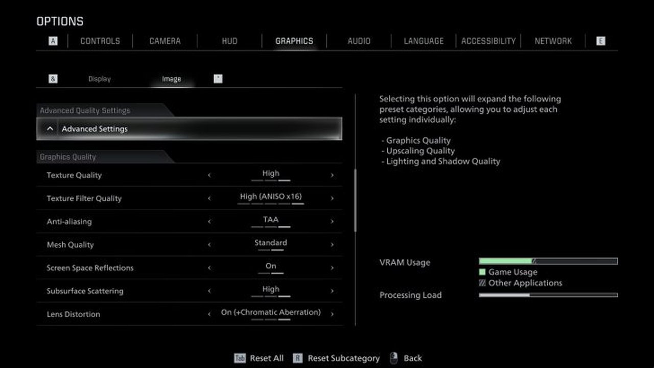 Oyunun grafik ayarları menüsü geniş kapsamlı; Display, Image ve Advanced Quality Settings başlıkları altında birçok alt bölüm bulunuyor. Öte yandan, bu menü size ince taneli kontrol imkânı veriyor.